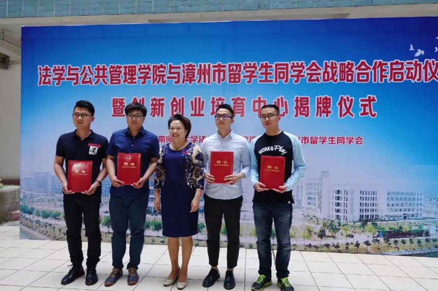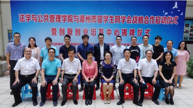 为进一步推进创新人才培养模式,推动产学研合作上新台阶,5月11日下午,漳州市留学生同学会与闽南师范大学法学与公共管理学院战略合作启动仪式暨创新创业培育中心揭牌仪式在博文楼西区中庭举行,漳州市留学生同学会会长、市人大常委会副主任李珊珊,闽南师范大学副校长蒋一婷,漳州市留学生同学会副会长、市发改委主任苏孝道,漳州市留学生同学会副会长、原市政府副秘书长徐建成,漳州市委统战部部务会成员、调研员、机关党委书记黄文龙,闽南师范大学招就处领导、闽南师范大学法学与公共管理学院领导出席仪式。活动由漳州市留学生同学会闽南师大分会副会长、闽南师范大学法学与公共管理学院副院长黄耀明主持。漳州市留学生同学会及闽南师范大学法学与公共管理学院师生共计60余人参加仪式。