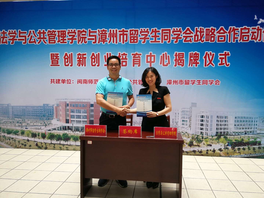 致辞后,漳州市留学生同学会副会长、秘书长、漳州市发改委主任苏孝道与闽南师大法学与公共管理学院党委书记徐继红共同签署战略合作框架。