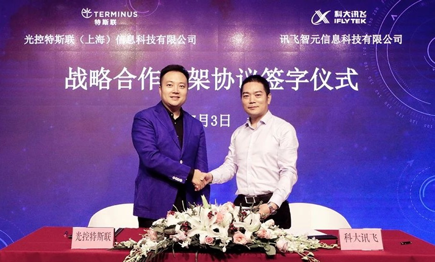 7月3日,重庆欧美同学会(重庆留学人员联谊会)副会长,光大控股董事总经理艾渝与科大讯飞轮值总裁、智慧城市BG总裁陈涛共同签订战略合作框架协议,宣布未来三年合作落地百亿级项目,重点布局物联网与人工智能技术深度结合,推进城市发展智慧化