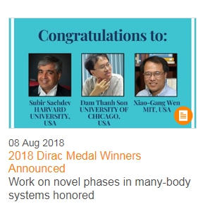 8月8日,国际理论物理中心(ICTP)宣布了2018年狄拉克奖章(Dirac Medal)的获得者,分别是哈佛大学的Subir Sachdev、芝加哥大学的Dam Thanh Son和麻省理工学院的华人学者文小刚。官方表示他们获奖的理由是在研究量子力学如何影响多体系统方面做出了独立贡献,引入了原创的交叉学科技术。