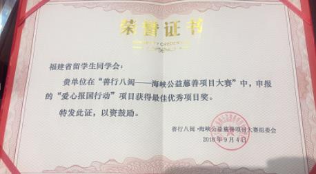 为弘扬公益慈善精神,传播公益慈善理念,9月4日福建省慈善总会在福建会堂举办首届“善行八闽——海峡公益慈善项目大赛”决赛。福建省留学生同学会的“爱心报国行动”项目入围决赛并荣获最佳项目奖。