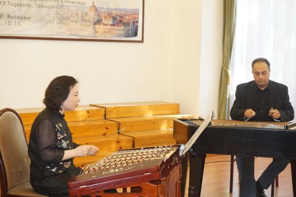 刘月宁教授与匈牙利李斯特音乐学院教授鲍洛格·卡尔曼用中匈扬琴合奏了匈牙利的《索特马尔舞曲》。