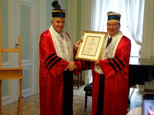 欧洲科学院副院长安特·格列博达向华裔教授兰玉彬授予欧洲科学院院士荣誉勋章。