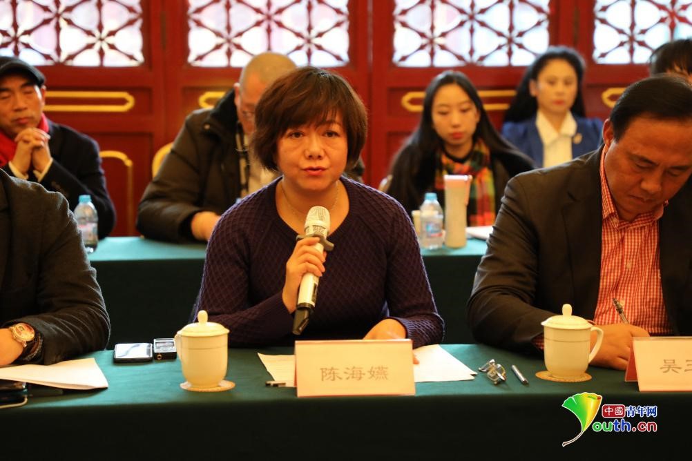 留苏分会青委会副秘书长,中品正源(北京)有限公司执行董事、总经理陈海嬿在座谈会上发言。中国青年网记者李虹静摄