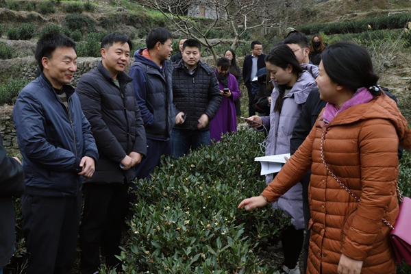 2018年12月4日,欧美同学会海归专家服务团邓燔学长(右)在茶田现场传授种茶经验。