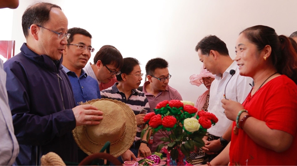 2018年8月9日,欧美同学会海归专家服务团在西吉县硝河乡参观爸爸的选择公司捐赠的编织扶贫车间。图为王丕君秘书长(左一)与车间负责同志交谈。