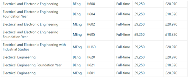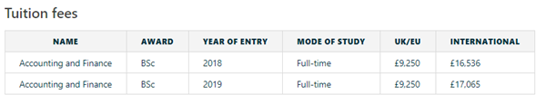 我们再来看一下2019年QS世界排名96的南安普顿大学。南安普顿大学是英国大学专业评级中,唯一一所每个理工部门都收到五星研究评级的大学,被公认为世界顶尖理工大学之一。其王牌专业电子电气专业每年学费如上图所示是20970镑,折人民币18万多,而会计与金融等商科类专业费用相对低一些,三年本科阶段的国际生学费为17065英镑/年,折人民币15万左右。