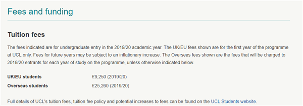 这是伦敦大学学院(UCL,2019QS世界排名第10)最热门的统计经济金融专业2019学年的学费情况,国际生学费约为25260英镑,合人民币也是22万左右,而计算机类的专业学费为29220镑/年,合人民币也是25万多,其他一些需要用到实验室的专业学费也相对高一些,所谓越好的学校学费越贵,准备去英国G5学校的话,建议仅学费方面每年至少要准备20万。
