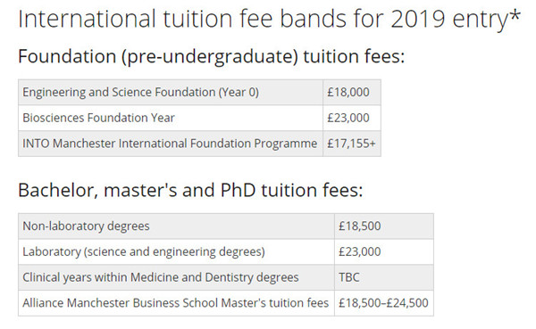 除了G5高校,我们可以再看一下非G5高校方面,我们以2019年QS世界排名 29,位于英国第二繁华城市曼彻斯特的世界著名顶尖研究型大学的曼彻斯特大学为例。从图中我们可以看出,需要用到实验室的理工科专业的学费普遍高于文科类专业,折合每年人民币约20万左右,文科类的专业约16万人民币,而商科的费用和理工科基本一致。