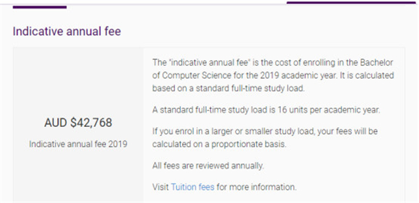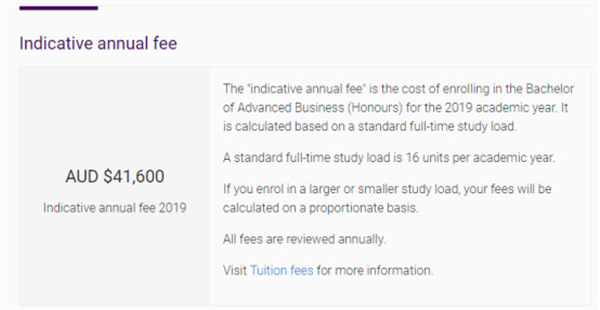广受中国留学生青睐的悉尼大学(2019年QS世界排名第42)学费根据学生所选的专业以及课程不同而有变化,我们同样以商科专业为例,第一年的学费为42000澳币,折合人民币约20万多;而电气工程等工程类专业第一年学费就明显高于商科类专业,为46500澳币,折合人民币约23万,也存在一定的差距。