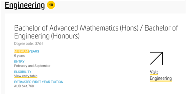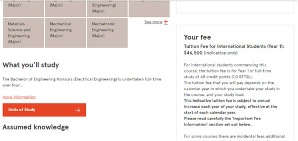 再来看一下创立于1949年,简称UNSW,2019年QS世界排名第45,主校区位于新州首府悉尼的澳大利亚著名的工程王国-新南威尔士大学,我们以其热门的商科专业为例,其2019年商科类专业的第一年的学费约为39360澳币,折合人民币约为19万,三年本科读完仅学费方面需要准备人民币约60多万;而新南威尔士大学实力最为强劲的工程专业第一年学费约为41760澳币,折合人民币约为20万,比商科类专业费用仅稍微高一点,差距不是很大。