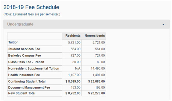 再来看一下一流的公立大学加州大学伯克利分校,其许多科系位于全球大学排行前十名,是世界上最负盛名的大学之一,常被誉为美国乃至世界最顶尖的公立大学。其2018-19年度一学期的国际生学费加上学校管理费等费用为23278美元,一年两个学期也就是46556美元,合人民币约33万,可见顶级公立大学的学费也与私立大学不相上下了。