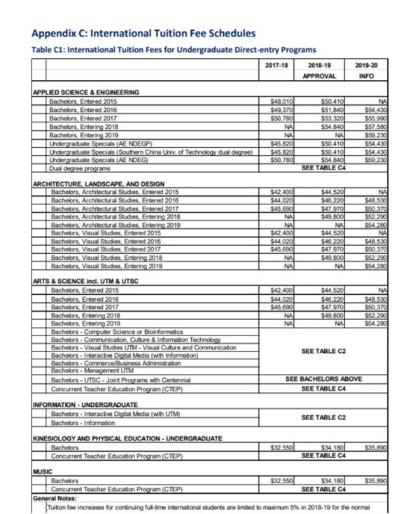 多伦多大学(2019年QS世界排名28),多伦多大学坐落在加拿大第一大城市多伦多,被公认为是加拿大综合实力数一数二的优秀大学。上图中我们可以看出2019年入学的应用科学与工程专业本科总学费为59230加币,合人民币约30万,而商科类专业年学费也是54280加币,折合人民币也为28万,可以说是一点也不便宜了。