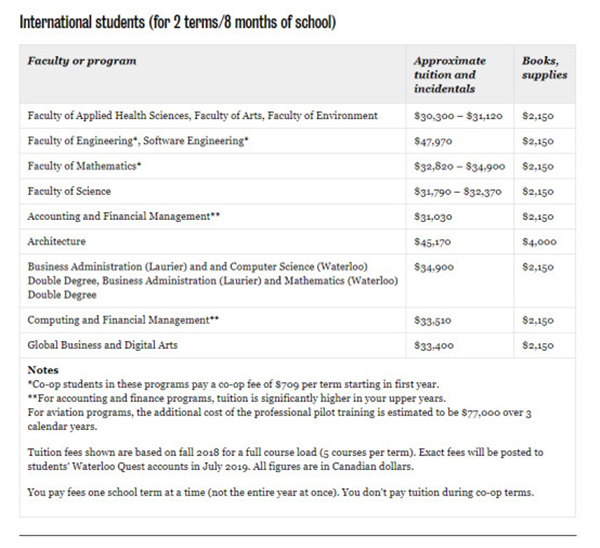 广受理科生喜爱的滑铁卢大学(2019年QS世界排名163),滑铁卢大学因为享誉全球的co-op带薪实习项目吸引着越来越多的学生申请,并且其计算机专业也是实力强劲。可以看到,最热门的工程类、软件类专业学费最贵,达到了47970加币/年,合人民币约25万,而商科专业则便宜很多,为31030加币/年,合人民币约16万。