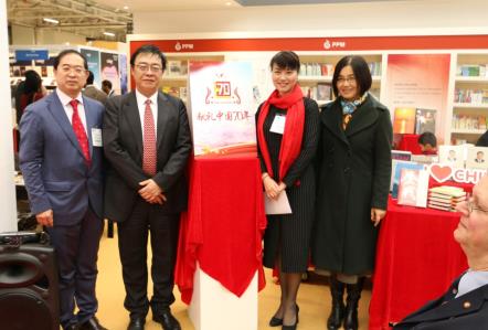 中国驻英大使馆公使衔参赞于芃先生、中国文化和旅游部驻伦敦办事处主任薛伶女士、江苏省商务厅驻英代表赵幸生先生、凤凰出版传媒集团代表俞慧洵女士为“建国70周年献礼图书展”活动揭幕