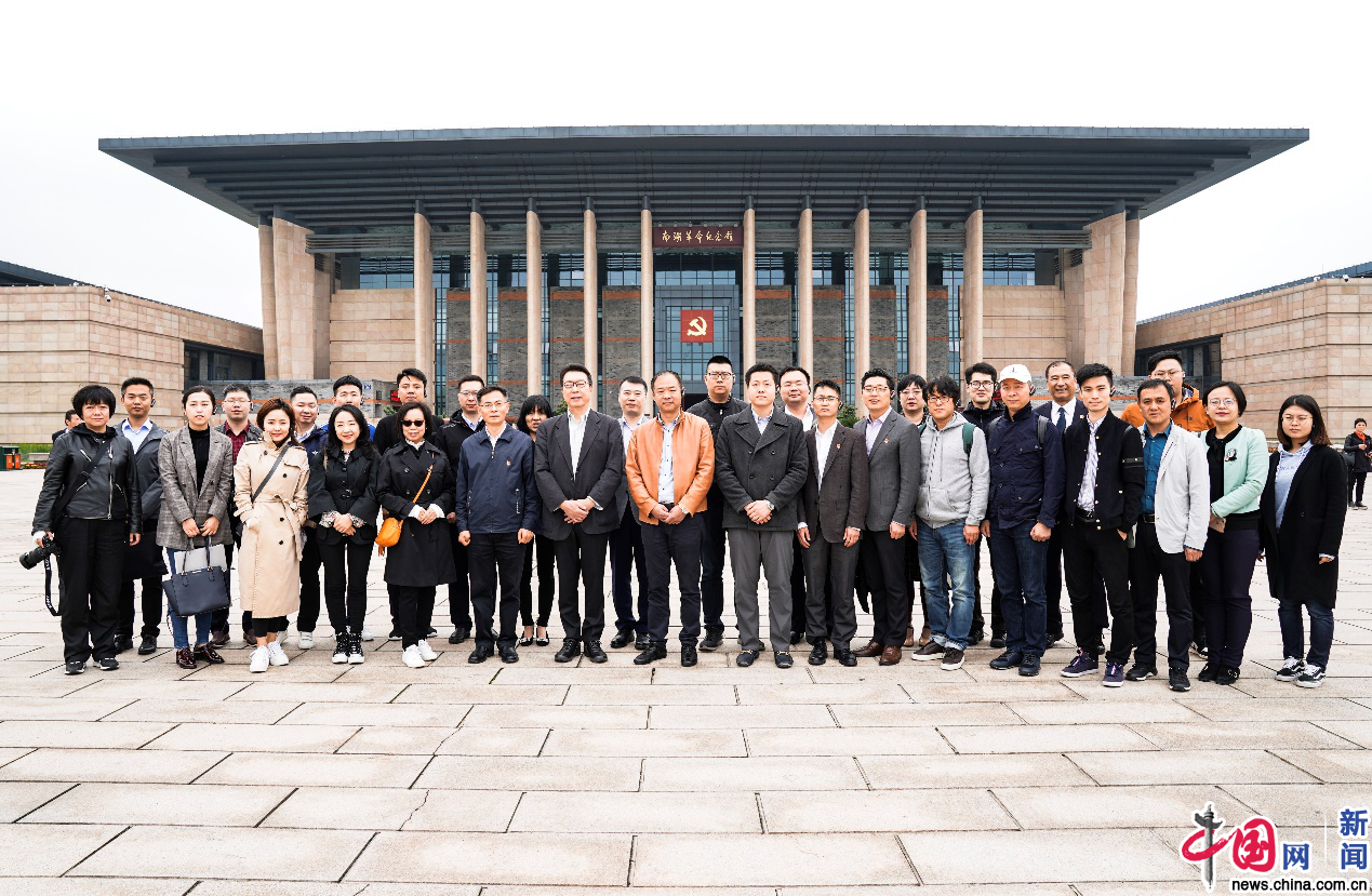 2019年4月10日,浙江嘉兴,欧美同学会留学人员代表和媒体记者在南湖革命纪念馆前合影。中国网 王月博 摄