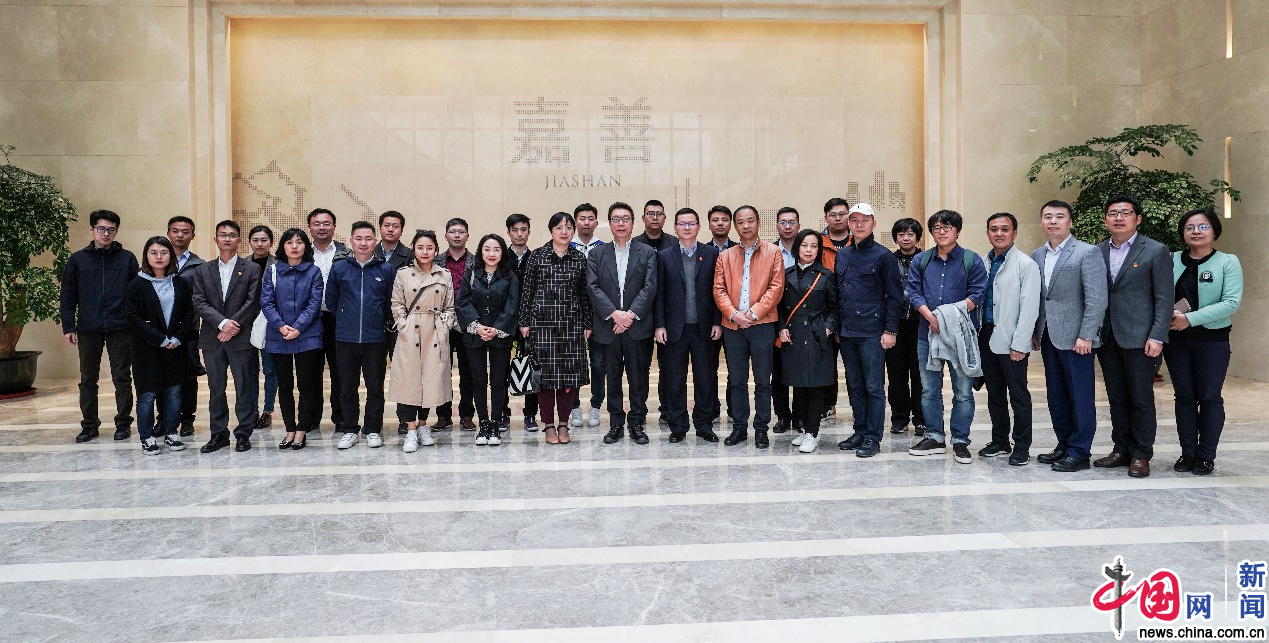 2019年4月10日,浙江嘉善县,欧美同学会留学人员代表和媒体记者在嘉善县城市规划展示馆合影。中国网 王月博 摄