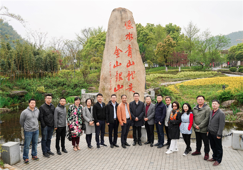 2019年4月11日,浙江安吉余村,欧美同学会留学人员代表在“绿水青山就是金山银山”石碑前合影。中国网 王月博摄