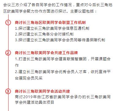 为进一步助推长三角地区实现更高质量的一体化发展,更好发挥留学人员作用,省欧美同学会于4月19日在南京组织召开2019年长三角地区欧美同学会服务区域一体化发展联席会议,江苏、上海、安徽三地欧美同学会参会。
