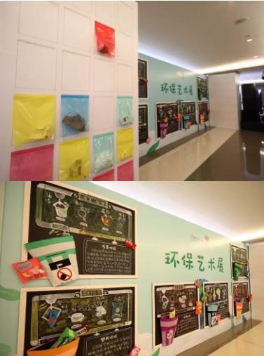 随后在杨梅红国际美校的工作人员的引导下,将垃圾分类装好,贴在墙上,从而完成本次环保艺术展。
