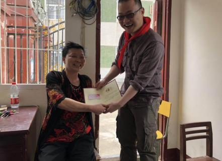 当天的捐赠现场气氛热烈、感人。武汉市最美乡村教师、黄陂区十佳道德模范、百名师德标兵、十棵松小学教师杜春萍也受到了捐赠——36年无怨无悔,她坚守农村教师一线岗位,“要让更多的孩子走出山里”。12年前,为让学生吃上新鲜的蔬菜,她不慎跌落两米深沟,摔断脊椎,导致半身不遂。因为心中有梦,她靠着用废旧钢铁制成的简易助行器,坚持为孩子们上课。4月20日,53岁的杜春萍缓缓地移动简易助行器,接过全新的拐杖,满脸笑意。