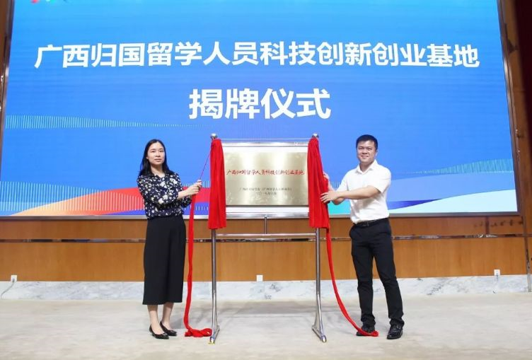 广西欧美同学会(广西留学人员联谊会)副会长李唯与南宁中关村信息谷资产管理有限责任公司总经理梁雁为基地揭牌