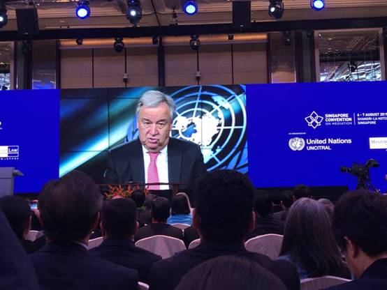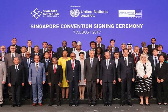 《联合国关于调解所产生的国际和解协议公约》(简称《新加坡调解公约》),于2019年8月7日在新加坡开放签署。新加坡总理李显龙、联合国负责法律事务的助理秘书长史蒂芬·马蒂亚斯出席在新加坡香格里拉酒店举行的公约签署仪式并发表讲话,联合国秘书长安东尼奥·古特雷斯通过视频致辞祝贺。签署仪式共有67个国家和地区的代表团参加。中国商务部部长助理李成钢率领中国政府代表团出席签署仪式,并代表中国签署该公约。目前公约签署国已达46个,其中包括中国、美国、韩国、印度、新加坡、哈萨克斯坦、伊朗、马来西亚、以色列等在内的46个国家。