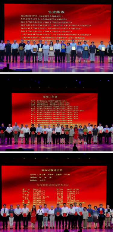 江苏省委统战部常务副部长李国华为先进集体颁奖,张晓东常务副会长代表南京欧美同学会上台领奖,南京欧美同学会秘书长刘必伟作为先进工作者接受表彰,徐振凯学长、李立新学长作为优秀归国留学人员代表接受表彰。