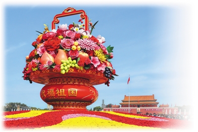 天安门广场上的“普天同庆”花坛。本报记者 贺 勇摄