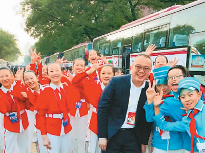 10月1日,美国华人企业家联合会会长施乾平与参与新中国成立70周年庆祝活动的孩子们合影。施乾平供图