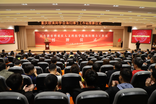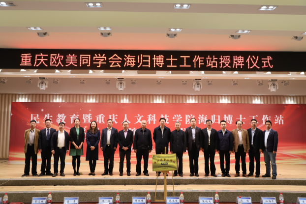 10月16日,“民生教育集团暨重庆人文科技学院海归博士工作站”揭牌仪式在重庆人文科技学院图书馆报告厅举行。重庆欧美同学会党组书记、秘书长范文佳,重庆欧美同学会副会长熊榆,中国专利保护协会副会长彭支援,中国国际经济交流中心战略部副部长任海平,重庆人文科技学院校长张跃光出席仪式。来自合川区有关部门,教育行业有关专家,海归博士和学校师生代表共计200余人参加会议。揭牌仪式由重庆人文科技学院副校长孙敏主持。