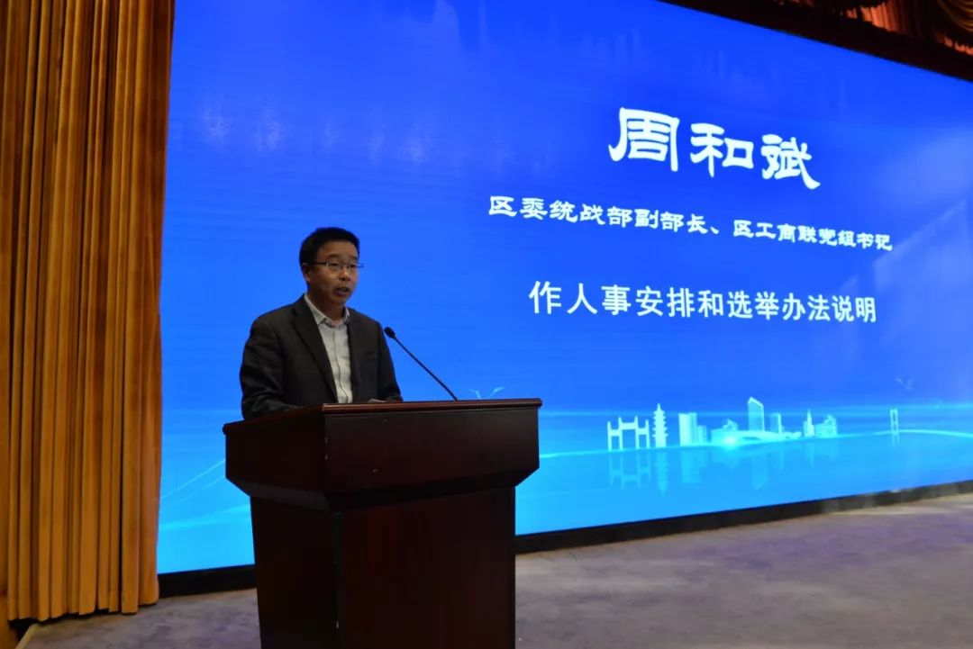 栖霞区委统战部副部长、区工商联党组书记周和斌作人事安排和选举办法说明。