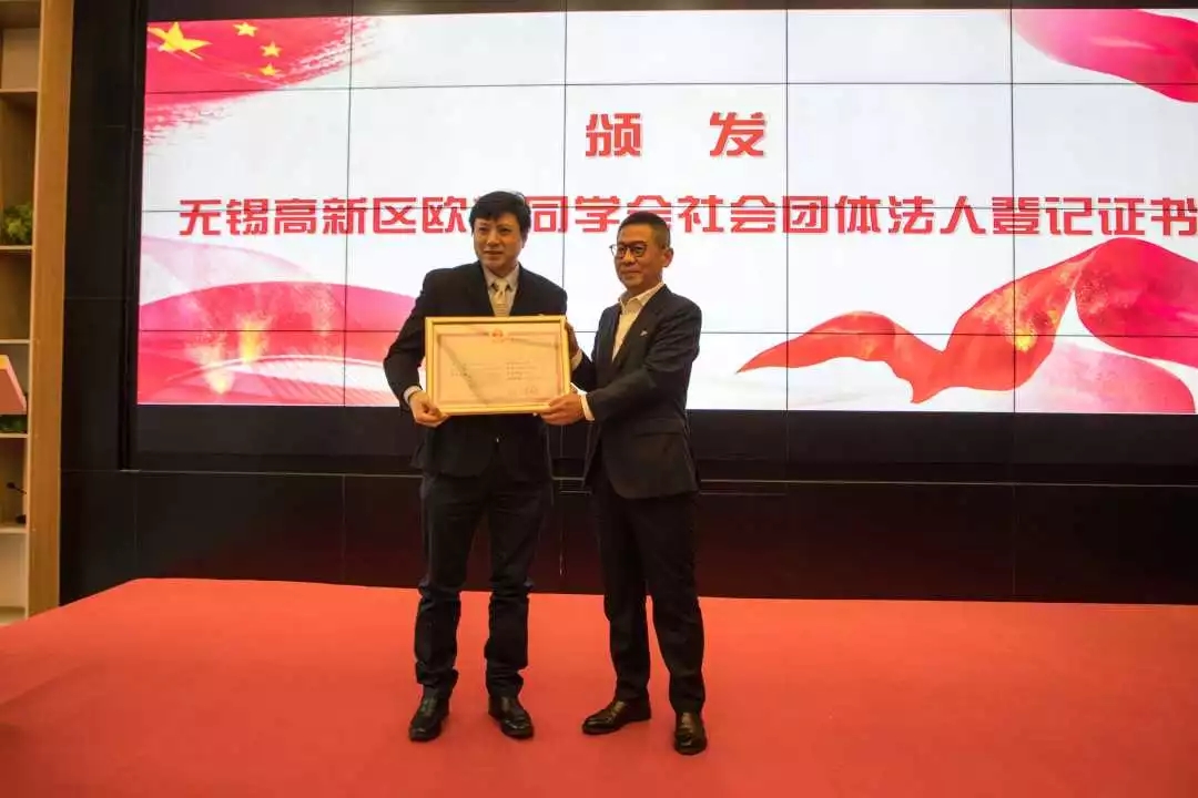 新吴区行政审批局局长向会长颁发无锡高新区欧美同学会社会团体法人登记证书。
