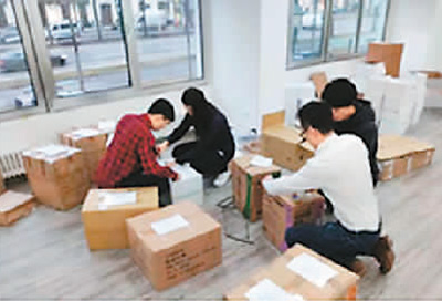 2月5日,剑桥中国学联的同学将物资清点完毕,贴上捐赠信息,等待物流公司取货。剑桥中国学生学者联谊会供图