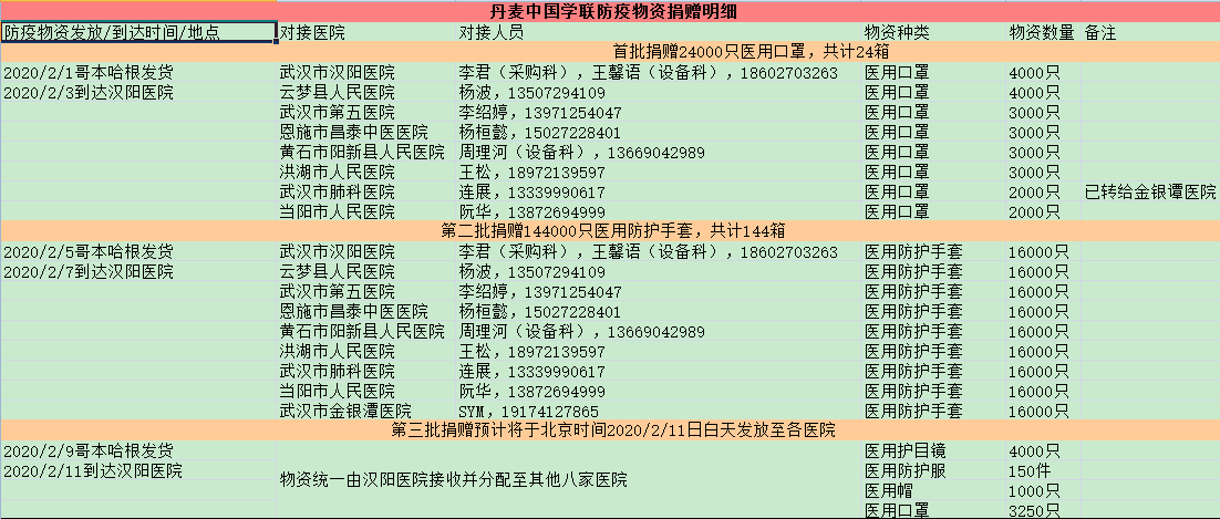大年初一晚,学联向使馆提出请求帮助解决捐赠物品运输问题。由大使坐镇,商务参赞和教育组负责人立刻与国内民航总局联系,从初一夜晚奋战到初二凌晨,摸清了运输路径情况。在大使指示下,商务处和教育组与学联、国航哥本哈根办事处共同召开会议,商讨具体的运输问题。随后,教育组负责人又赶到机场与学联干部一起装运捐赠物品,使馆办公室则连夜为捐赠物品出具证明。在各方齐心努力下,丹麦中国学联第一批捐赠物品24000个口罩于1月31日顺利运抵国内。2月3日,武汉汉阳医院收到此批捐赠物品。据了解,这是湖北疫区收到的最早一批来自欧洲的捐赠。