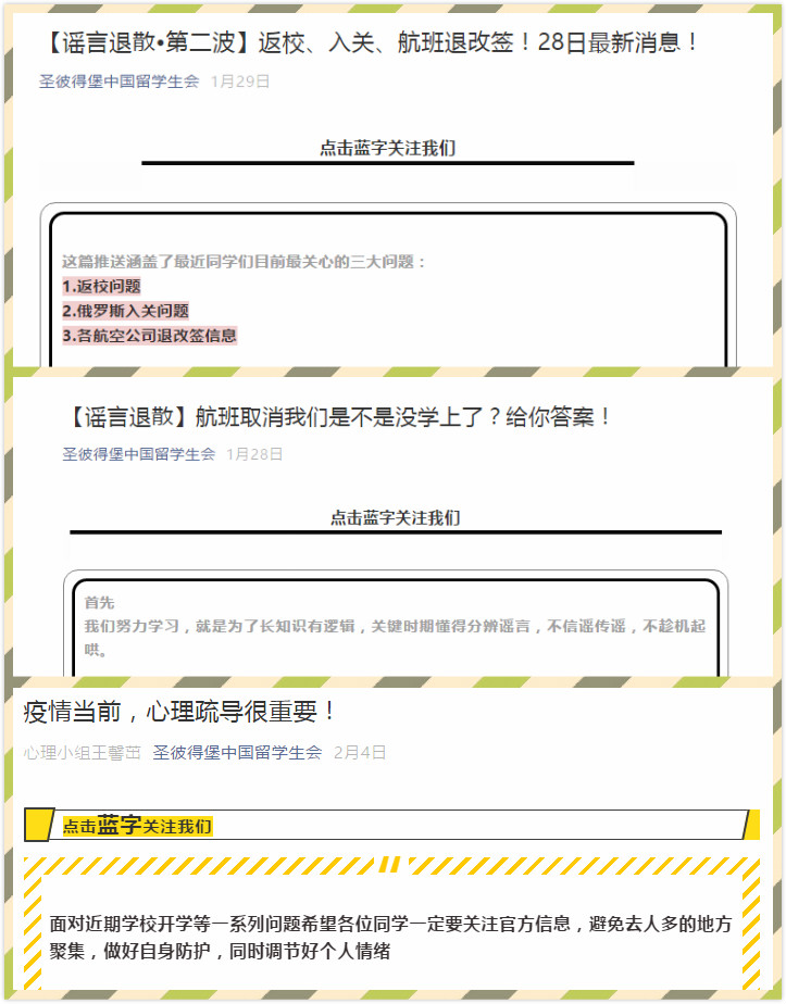 在总领馆和教育部的指导下,教育领事发动学生会积极行动,主动和圣彼得堡领区20多所中国留学生较多的俄方高校外办联系,将各高校最新的中国学生返校政策公布在微信公众号上。刚开始,各校对新冠肺炎疫情反应不一,导致谣言四起,部分学生在各种微信群转发道听途说的返校要求,打电话到教育组咨询相关政策。教育组和学生会同学一起紧急联系各高校外办,主动发声,及时将最新政策对外公布,基本做到每天一更新,并让大家大量转发,谣言不攻自破。截至目前,学生会微信公众号共更新信息18次。