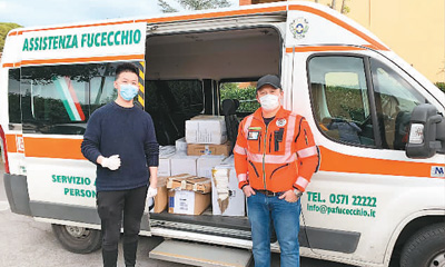 意大利当地医院工作人员(右)来叶先平的口罩加工厂运物资。 (均由受访者供图)