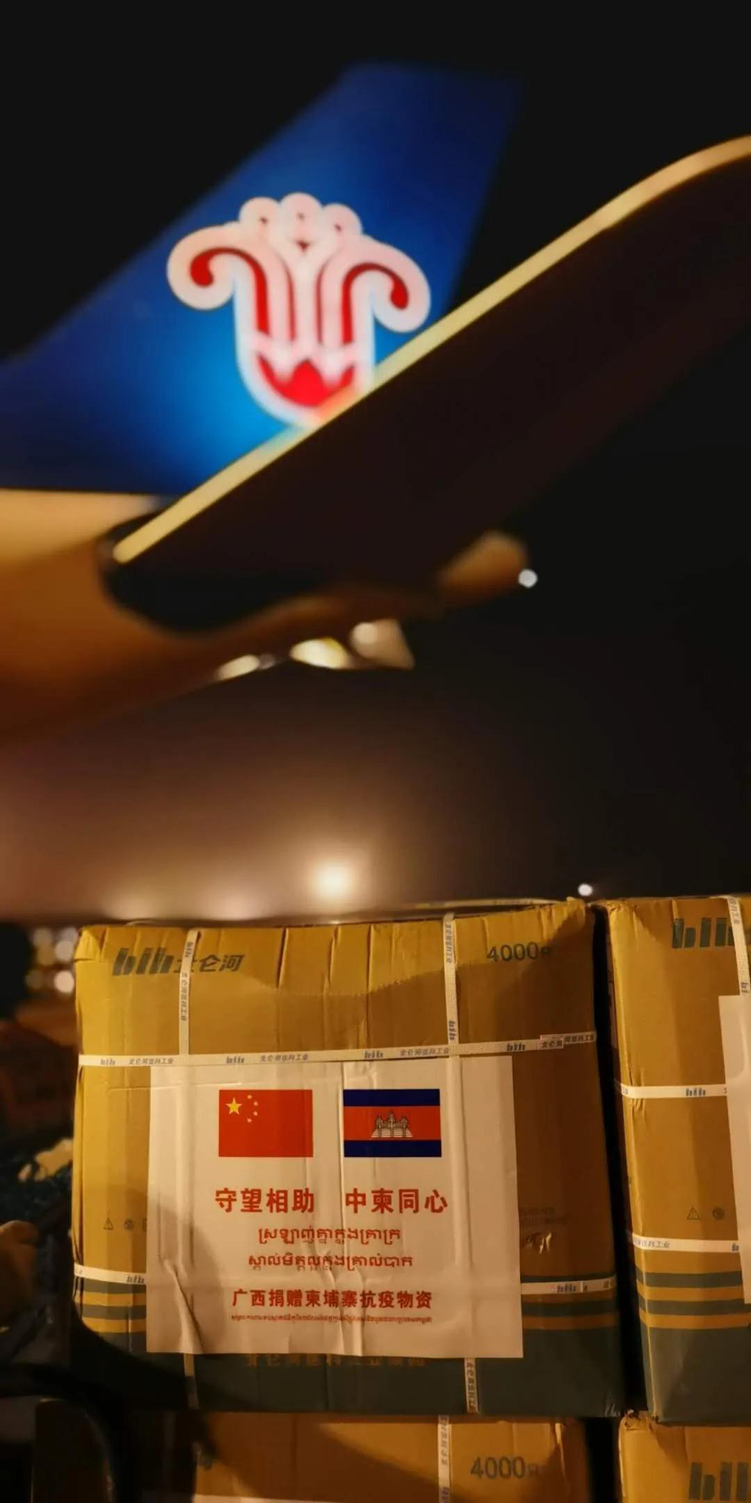 3月23日,中国政府赴柬埔寨抗疫医疗专家组一行7人从南宁出发前往柬埔寨金边,两架包机均载有援助柬埔寨的防疫物资。来自南宁机场货站的周圆学长与同事同力协作,快速高效完成了物资保障工作。