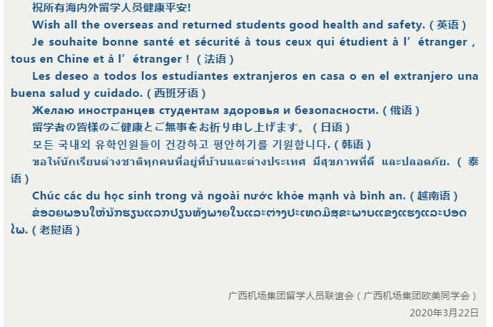在《给留学生的一封信》中,文末汇集了多语种的祝福语,这些都是由机场留联会学长们翻译而成,为各留学人员送去一份美好的祝福。