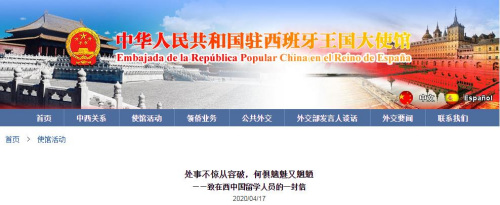 中新网4月17日电 中国驻西班牙大使馆网站17日发表“致在西中国留学人员的一封信”。驻西班牙使馆在信中表达了对在西留学人员的慰问;呼吁在西学子理性面对疫情,互帮互助,做好相关防护工作;勉励广大留学人员在不断克服苦难与自我成长中实现凤凰涅槃。