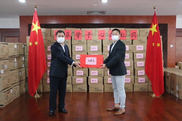 中国驻布里斯班总领事徐杰将防疫物资发放给中国留学生代表。(中国驻布里斯班总领馆供图)