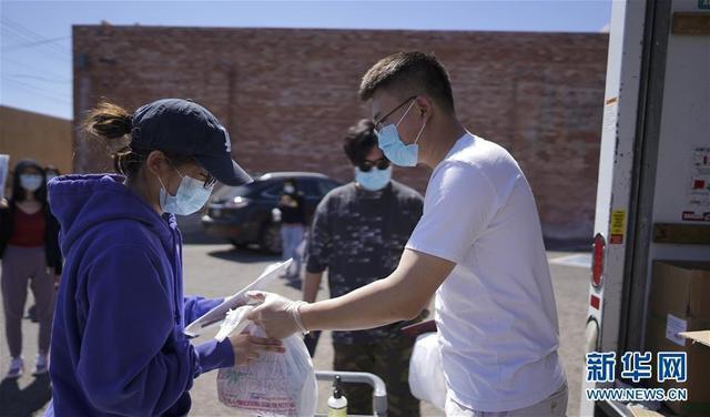 ↑4月12日,在美国亚利桑那州图森市,亚利桑那大学的中国留学生领取“健康包”。新华社发