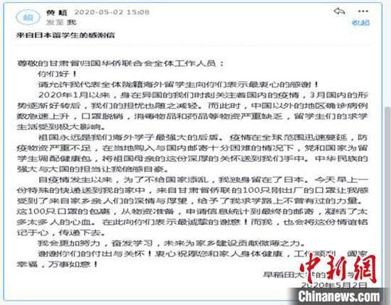 1日,日本东京工业大学和早稻田大学的甘肃籍留学生向甘肃省侨联发来感谢信。“祖国永远是我们海外学子最强大的后盾。疫情在全球范围迅速蔓延,防疫物资严重不足,在当地购入与国内邮寄十分困难的情况下,祖国为留学生调配健康包,将这份关怀送到我们手中,感动又自豪。”他们在信中写道。