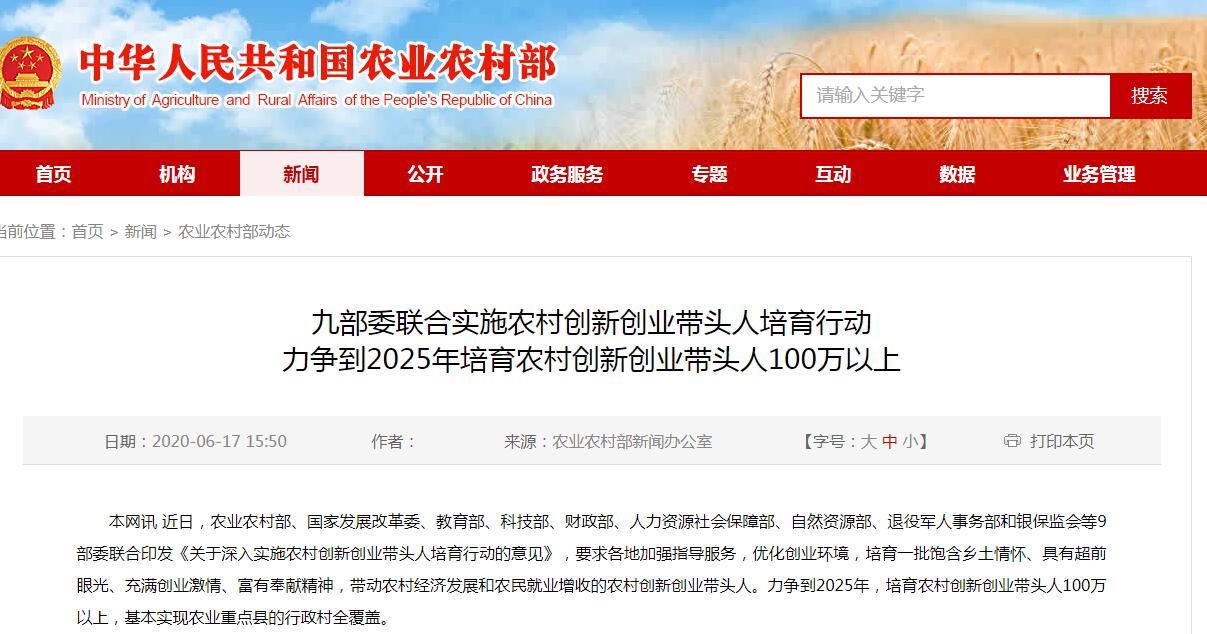 中国网6月18日讯 据农业农村部网站17日消息,近日,农业农村部、国家发展改革委、教育部、科技部、财政部、人力资源和社会保障部、自然资源部、退役军人事务部和银保监会等9部委联合印发《关于深入实施农村创新创业带头人培育行动的意见》,要求各地加强指导服务,优化创业环境,培育一批饱含乡土情怀、具有超前眼光、充满创业激情、富有奉献精神,带动农村经济发展和农民就业增收的农村创新创业带头人。力争到2025年,培育农村创新创业带头人100万以上,基本实现农业重点县的行政村全覆盖。