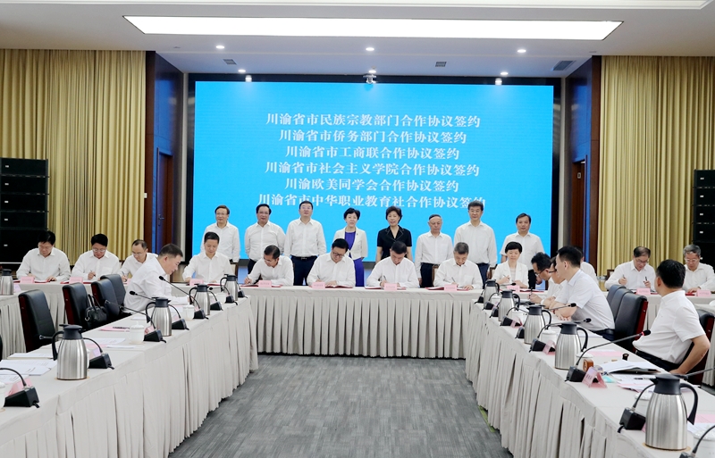 7月9日,川渝省市党委统战部协同参与成渝地区双城经济圈建设第一次联席会议在成都召开。会上,两地欧美同学会签订了《助力成渝地区双城经济圈建设合作框架协议》。重庆市委常委、统战部部长李静,四川省委常委、统战部部长田向利出席会议并见证签约。重庆市人大常委会副主任沈金强,重庆市政协副主席陈贵云,四川省人大常委会副主任陈文华,四川省政协副主席张雨东出席会议。