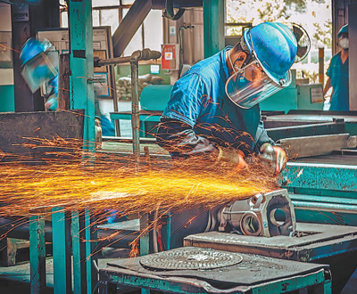四川省绵阳市,一家汽车零部件制造企业的生产车间内,工人正在作业。李孝鑫摄(影像中国)