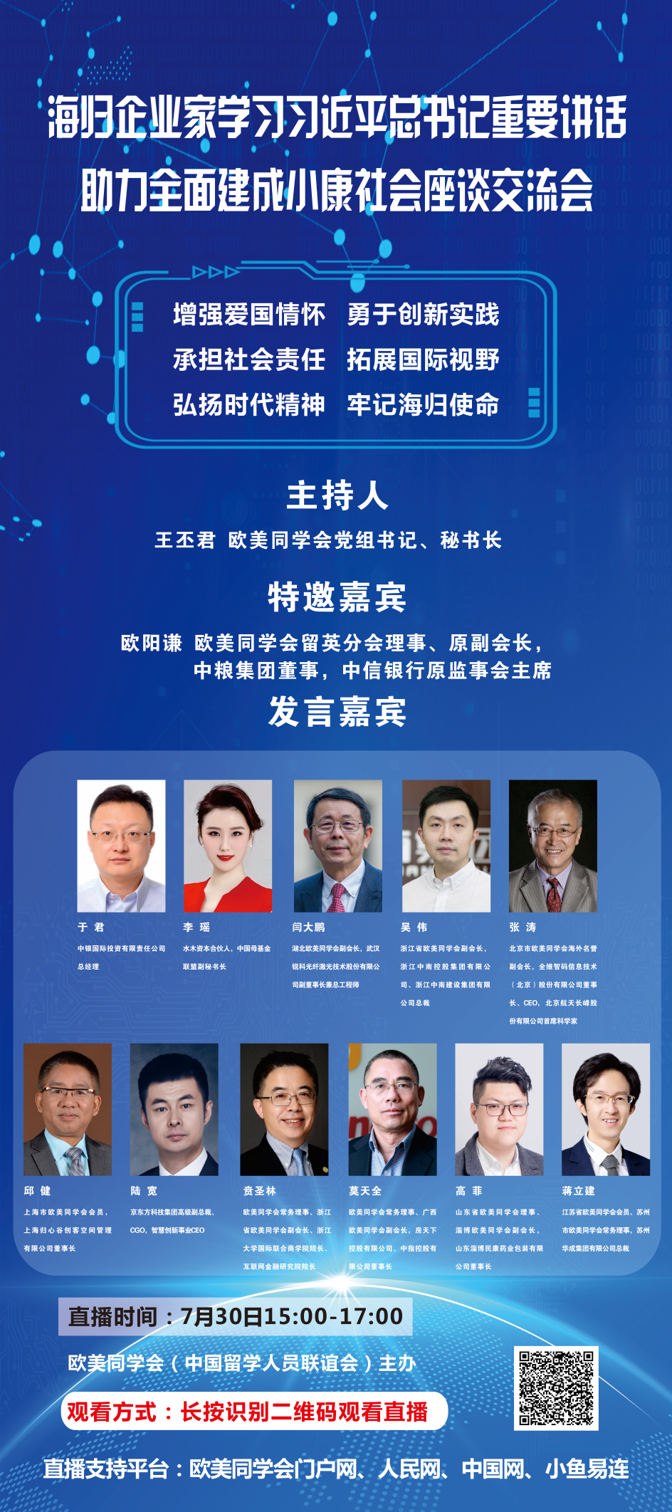 总书记的重要讲话在广大留学人员特别是海归企业家中间引发热烈反响。7月30日下午,欧美同学会将邀请多位海归企业家围绕学习习近平总书记在企业家座谈会上重要讲话精神的心得体会、助力当前经济高质量发展的思路举措以及为全面建成小康社会进行建言献策等3个方面发言。届时,欢迎广大留学人员和网友在线观看。