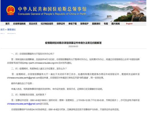 答:受新冠肺炎疫情影响,自2020年4月13日起,总领馆领事服务大厅暂停对外办公。如恢复对外办公,将通过总领馆微信公众号“中国驻珀斯总领馆”和官方网站http://perth.chineseconsulate.org/chn/及时发布通知。