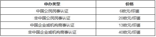 例2:中国公民为已入籍的子女办理出生证明认证(附翻译件),原件和翻译件上各有一个西外交部印鉴,因申请人为“非中国公民”,则费用为20+20+8.5共计48.5欧元。