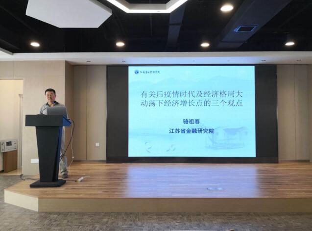 省社会科学院、江苏省金融研究院副院长骆祖春作《后疫情时代及世界格局大动荡下的经济增长点》主题讲座。